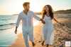 Transform this couple photo into a romantic pre-wedding beach shoot at golden hour. Maintain exact facial features and likeness of the original subjects. Place them running barefoot on a sandy beach with warm sunset backlight creating a halo effect on their hair, soft lens flare, shallow depth of field (f/1.8), cinematic color grading with teal and orange tones. They should be laughing, holding hands, wearing casual chic white linen outfits. Render with visible skin texture, natural pores, individual hair strands, and realistic eye catchlights to avoid an airbrushed look.