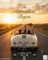 Create a cinematic 'Just Married' announcement art. View from behind of a vintage cream-colored convertible (Porsche Speedster) driving into a golden sunset. The license plate clearly reads 'JUST MARRIED'. Tin cans are trailing behind on strings on the asphalt road. The couple is in the front seat (visible from back of heads/arms in air celebrating). Maintain exact facial features and likeness (if visible in side mirror). Overlay text 'The Adventure Begins' in elegant script clouds in the sky. Nostalgic, happy, movie ending vibe, cinematic color grading, warm tones. Aspect Ratio: 4:5 (Vertical).